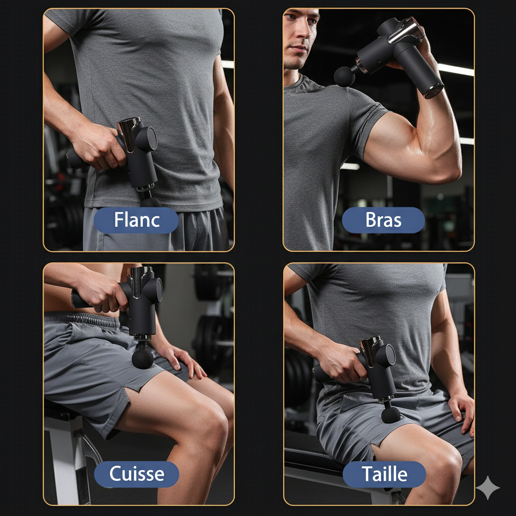 Utilisez 1 à 2 minutes par zone musculaire, jusqu’à 15–20 minutes au total. Évitez les excès pour ne pas irriter vos muscles.